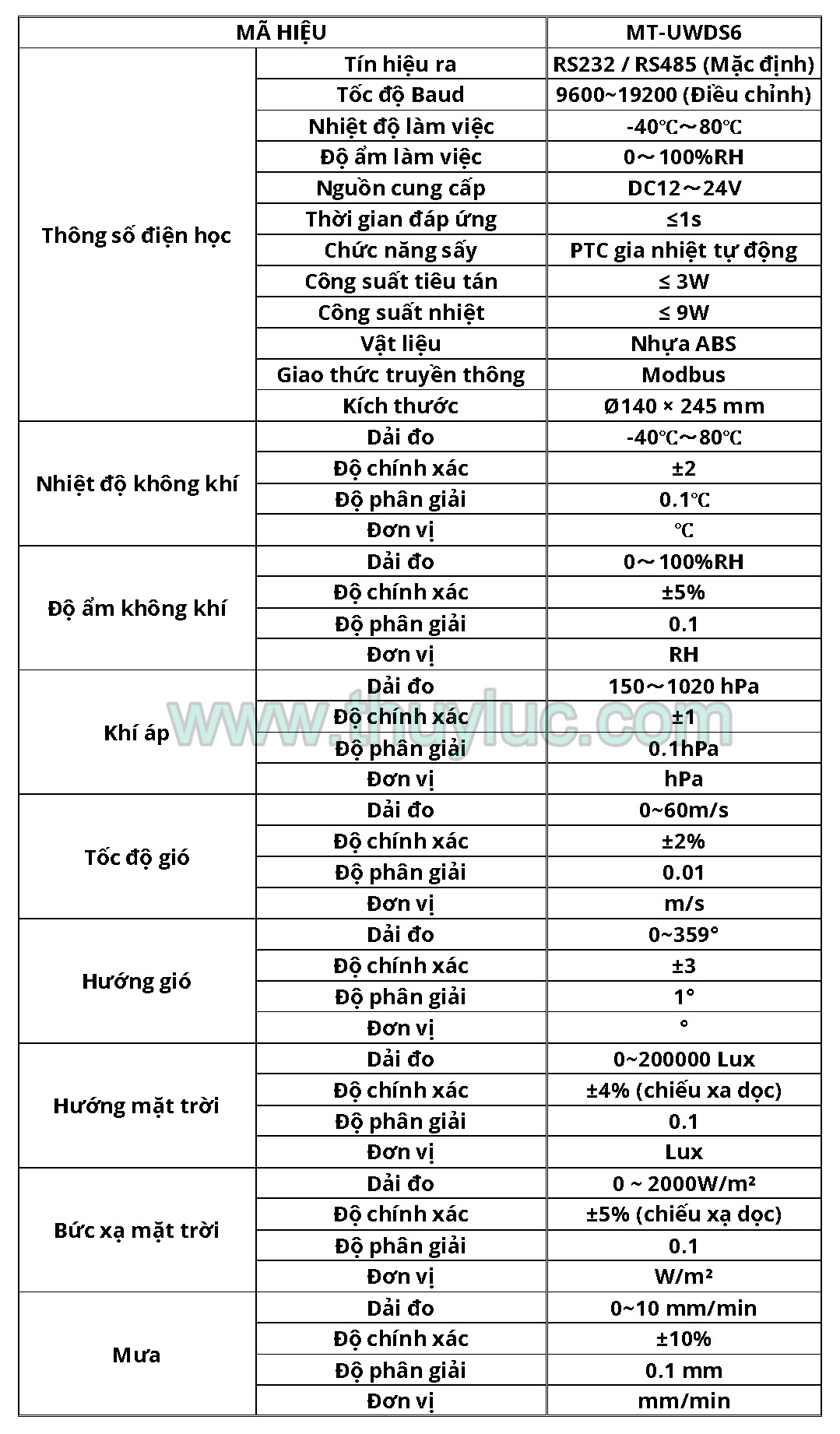 - Giao thức truyền thông MODBUS, đầu ra RS485 / RS232 tiêu chuẩn