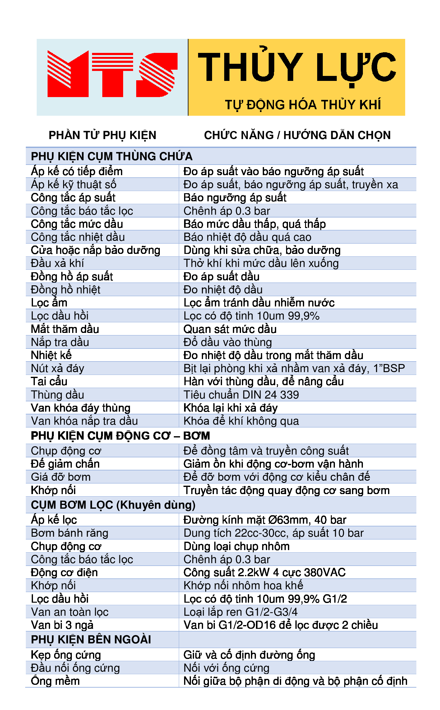 Dưới đây là các thiết bị phụ kiện cần thiết ngoài các thiết bị chính như bơm, van, động cơ, xilanh và các chức năng của chúng.