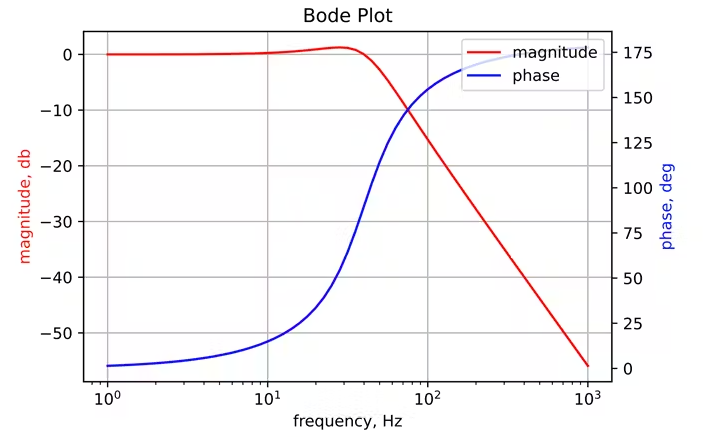 Biểu đồ Bode này cho thấy độ lớn và pha của một van mô phỏng có tần số tự nhiên là 40 Hz và hệ số tắt dần là 0,5. Cường độ giảm xuống −3 db. và độ trễ pha tăng lên khoảng 90 ở gần 50 Hz.